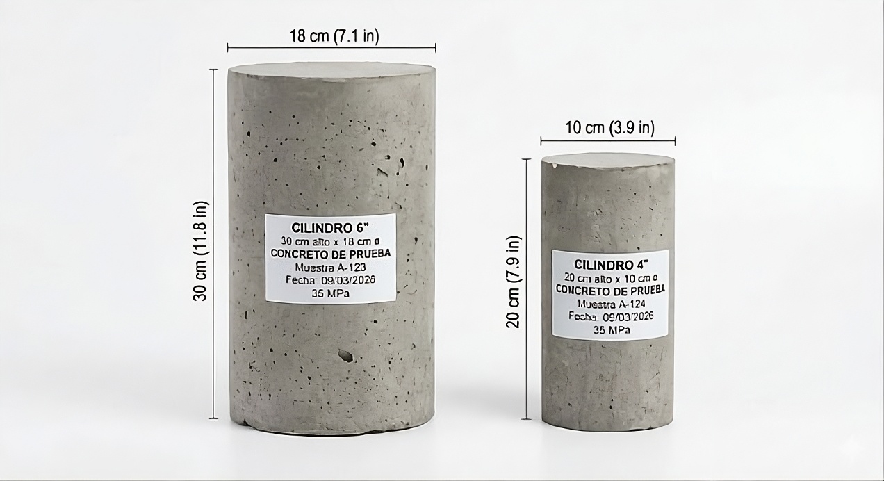 Pueden presentar microfisuras y están disponibles en dos tamaños. El cilindro de 6″ (18×30 cm) tiene un peso promedio de 19 a 23 kg, mientras que el de 4″ (10×20 cm) pesa en promedio 13.5 kg
