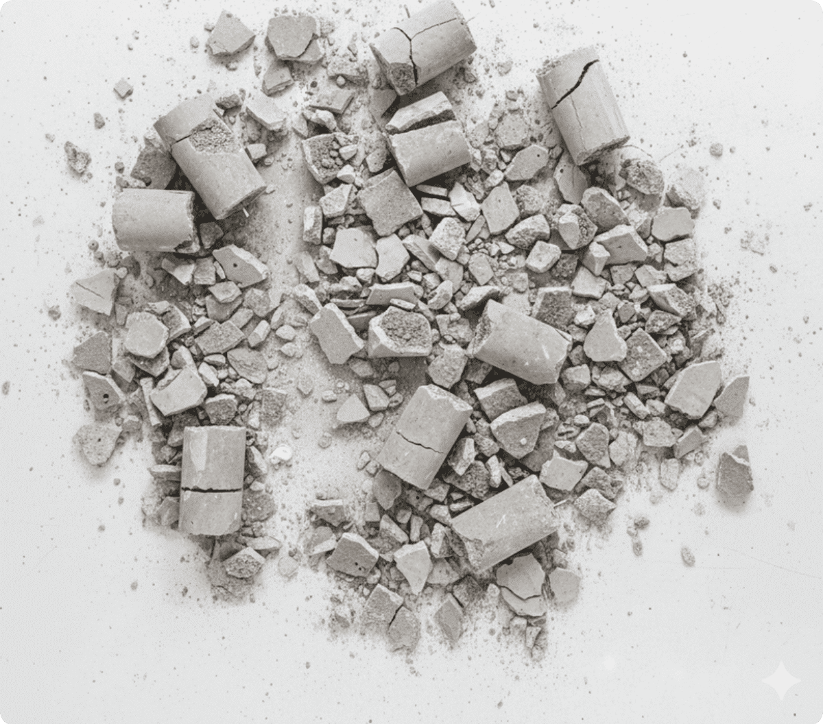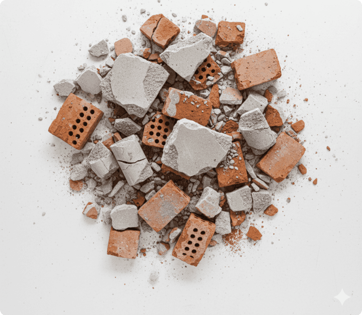 Concreto semidestruido limpio sin otros materiales y ladrillo con concreto semidestruido. Estos sirven para realizar capas de nivelación para andenes y bases.